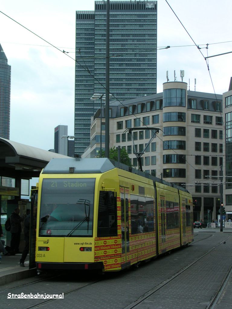 "33 am 21er zum Stadion! Jetzt!!" Mit dieser SMS wurden einige Wiener Hobbykollegen etwas durcheinandergebracht - tja, wäre doch bloß die Stadt auch dabeigestanden! ;-) Diese Wagentype R ist der Vorgänger der Flexity-Wagen, stammt von DÜWAG. Wikipedia meint dazu: Der R-Wagen war das weltweit erste in Serie produzierte Fahrzeug, das über einen hundertprozentigen Niederfluranteil verfügte. Da das erste Fahrzeug möglichst noch vor der Kommunalwahl 1993 in Frankfurt eintreffen sollte, hatte Düwag nur wenige Monate für Konstruktion und Bau zur Verfügung. Die sonst bei einem neu konstruierten Fahrzeug übliche Erprobung mit Prototypen musste aus Zeitmangel unterbleiben. Um die geforderten 100% an Niederflurfläche zu erreichen, kamen Fahrgestelle in Einzelradbauweise zur Anwendung, von denen jeder Wagenteil jeweils eines in Kastenmitte aufweist. Daher wurden nur drei statt der üblicherweise vier vorhandenen Fahrgestelle verbaut. Dies erwies sich in der Folgezeit als problemanfällig und führte auch dazu, dass nach 40 Fahrzeugen keine weiteren mehr beschafft wurden. Da haben wir in Wien mit dem ULF mehr Glück (oder Geduld) gehabt.