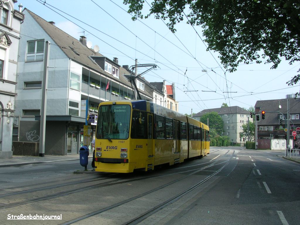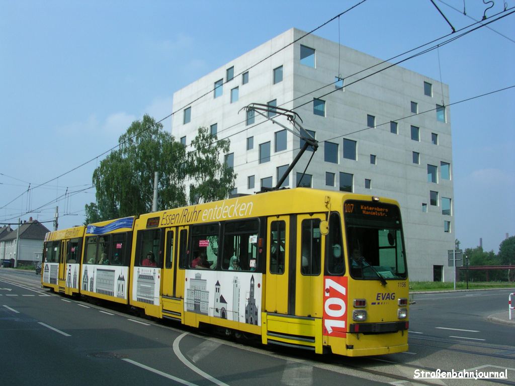 Nächste Station: Essen, Kulturhauptstadt des Jahres 2010. Aus diesem Anlass wurde die Meterspurlinie 107 zur Kulturlinie aufgewertet, was sich hauptsächlich darin äußert, dass in den Fahrzeugen und an den Haltestellen Hinweise auf Sehenswürdigkeiten entlang der Strecke zu finden sind. Der 107er wird komplett mit Stadtbahnfahrzeugen der Type M8C bedient, deren Türen eine Besonderheit haben: Man kann auf drei Niveaus aussteigen: Hochbahnsteig, normale Gehsteigkante und Straßenniveau. Für das Aussteigen auf Gehsteigniveau senkt sich der Trittkasten elektrisch ab, für das Straßenniveau gibt es eine zusätzliche Schwenkstufe (wie beim E2). Dieses System ist allerdings mitunter etwas störanfällig.