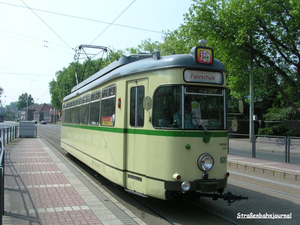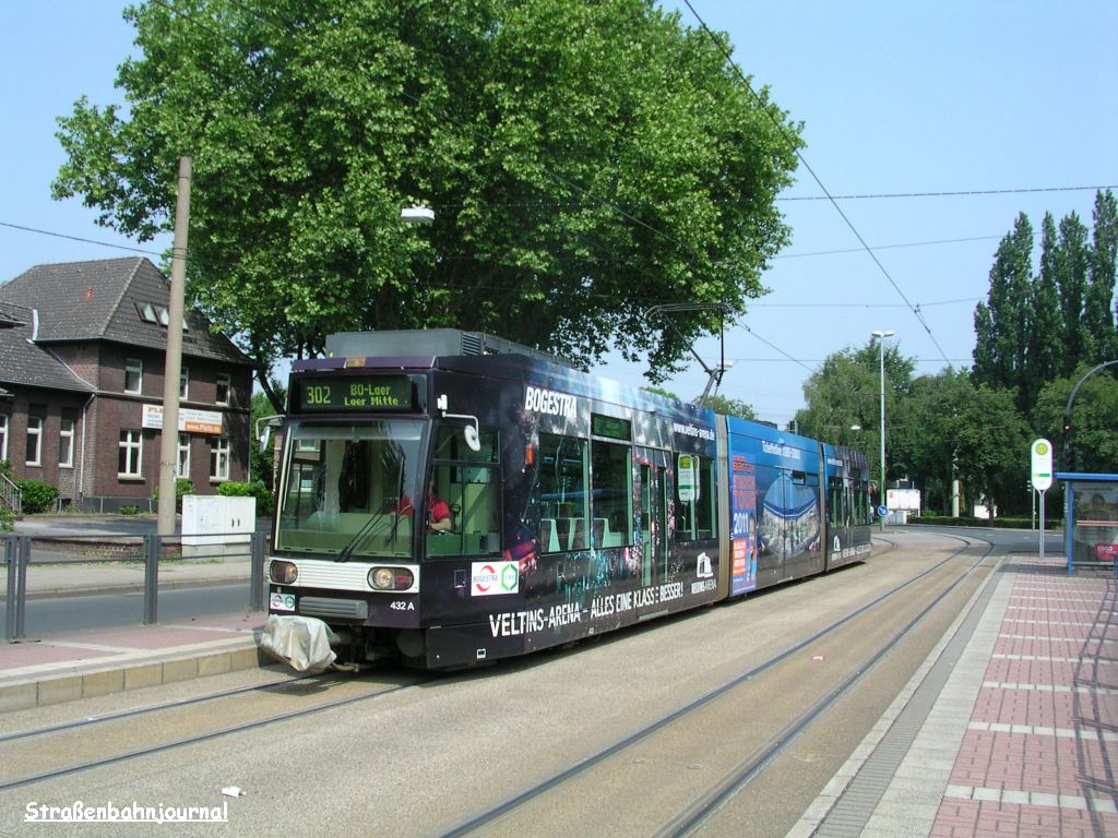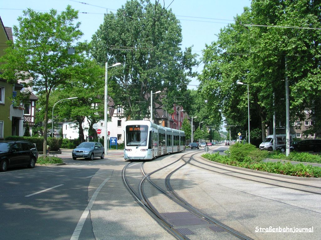 Nächster Halt: Bochum, hier ein DÜWAG-NF6D auf der Linie 302. Als Besonderheit öffnen sich die Türen der BOGESTRA-Fahrzeuge (BOGESTRA = Bochum-Gelsenkirchener Straßenbahn) berührungslos über Bewegungsmelder, was allerdings lästig sein kann, wenn sich eine Haltestelle direkt ohne Insel direkt auf der Fahrbahn befindet, da natürlich auch Fahrzeuge den Bewegungsmelder auslösen.
