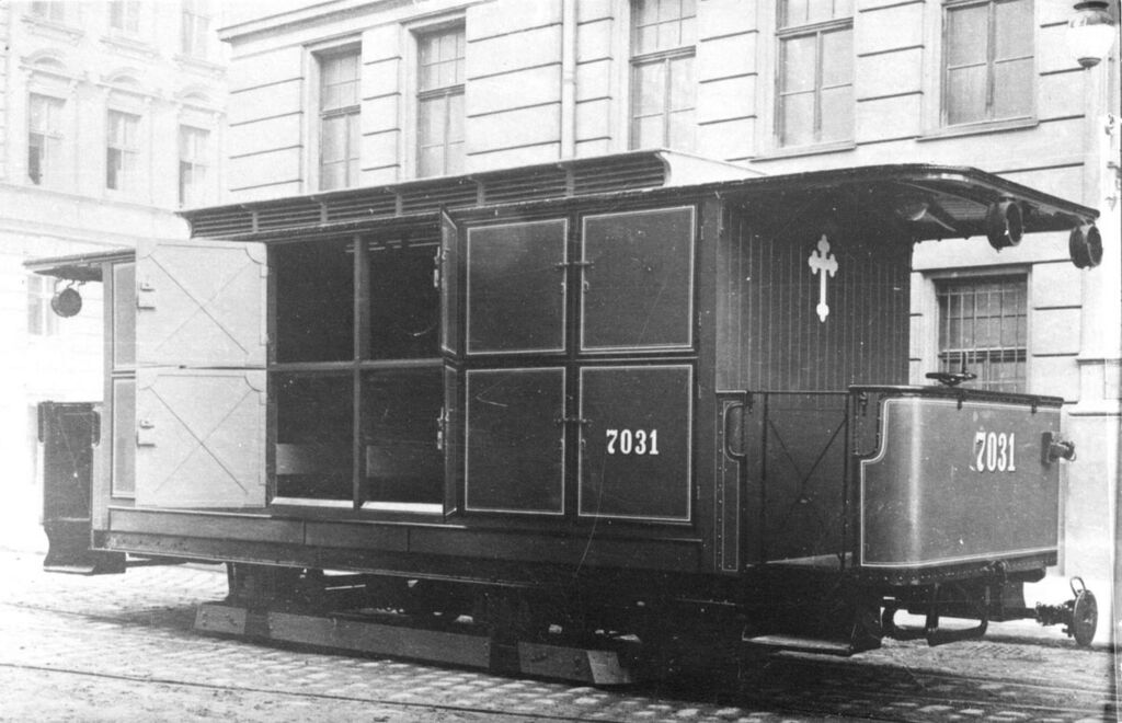 Das Foto der Wiener Verkehrsbetriebe aus 1918 zeigt den eben fertiggestellten Wagen in der Siebeneichengasse vor der Hauptwerkstätte.