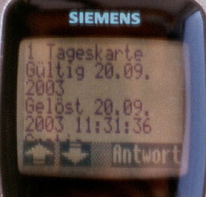Ja, auch das ist ein Fahrschein! Seit 20. 9. 2003 kann man Fahrscheine per SMS kaufen. Dazu schickte man ursprünglich eine Kurznachricht an die Nummer 0664/660 0 100 mit dem Text "W" und ev. der Anzahl der gewünschten Tagesfahrscheine. Nach Bestätigung kam die gewünschte Antwort, die als Fahrschein gilt.