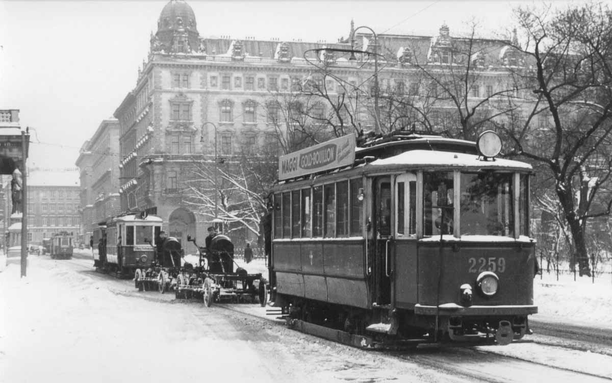 Auch schon lange vor ihrem Umbau zu Schneepflug-Hilfstriebwagen verwendete man die H1 gerne als Zugfahrzeuge für die Anhängepflüge. Ein solches Gespann mit dem Triebwagen 2259 sehen wir hier im Räumeinsatz auf dem Rathausplatz. Foto: Mag. Alfred Luft