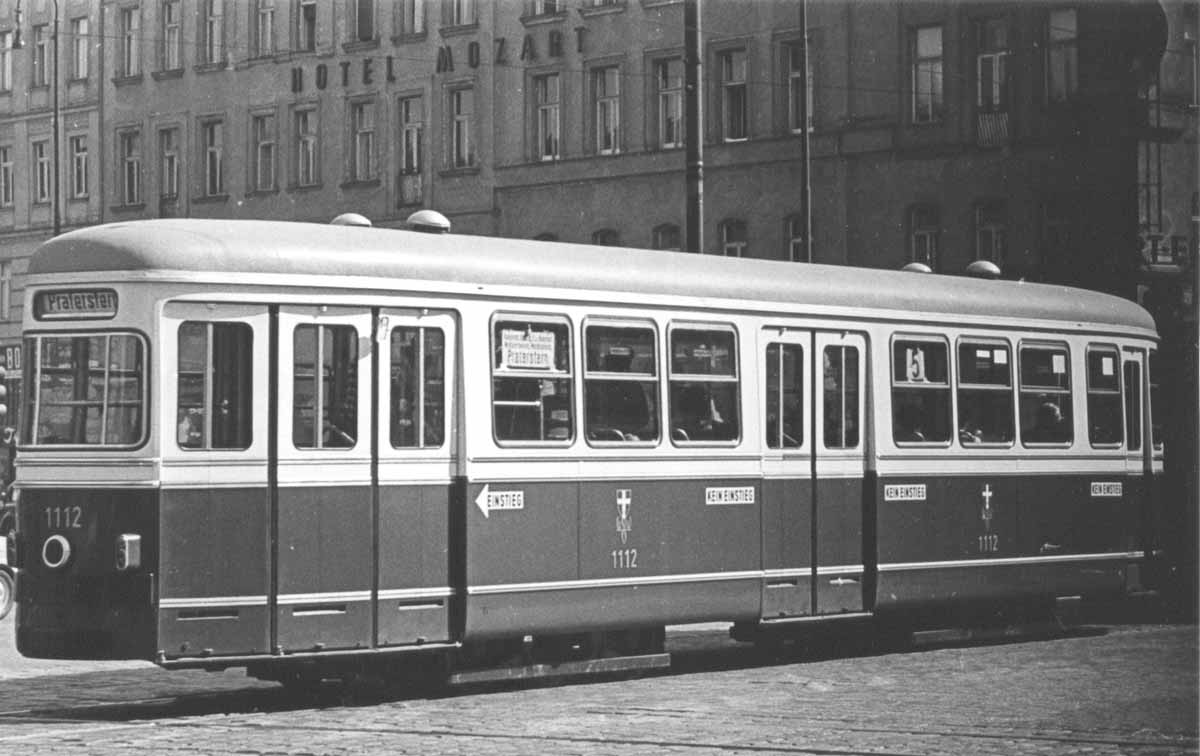 Der Wagen 1112 wenige Tage nach seiner Inbetriebnahme im Juni 1960 auf der Linie 5, vermutlich beim Franz-Josefs-Bahnhof. Beachtenswert die Anbringung der Routentafel, die nur die ersten c3 besaßen und die bald darauf geändert wurde.
