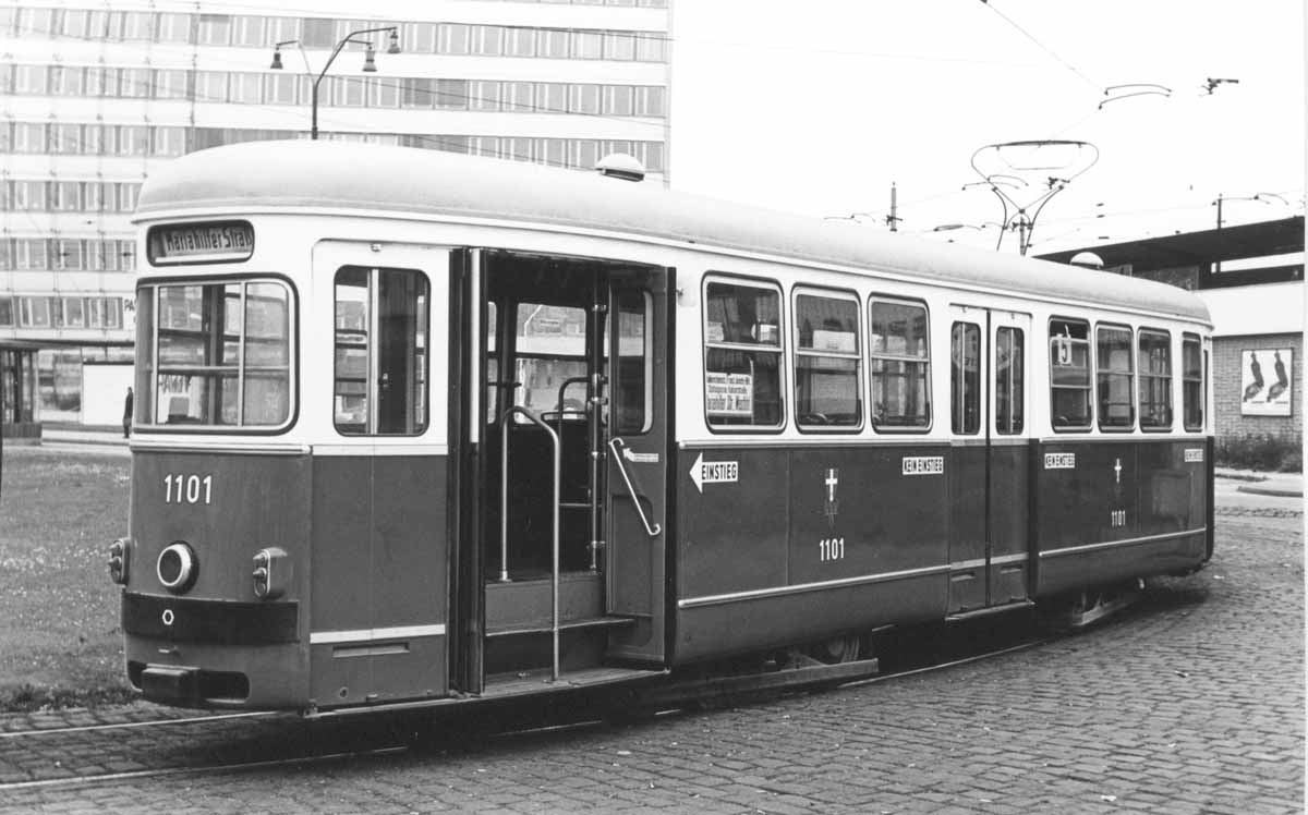 Beiwagen 1101 bereits in neuer Lackierung ohne zweite Zierleiste, aber noch im Schaffnerbetrieb auf der Linie 5 bei der Endstation Praterstern am 26. Oktober 1966. Die Türen sind innen bereits in grauer Ausführung.
