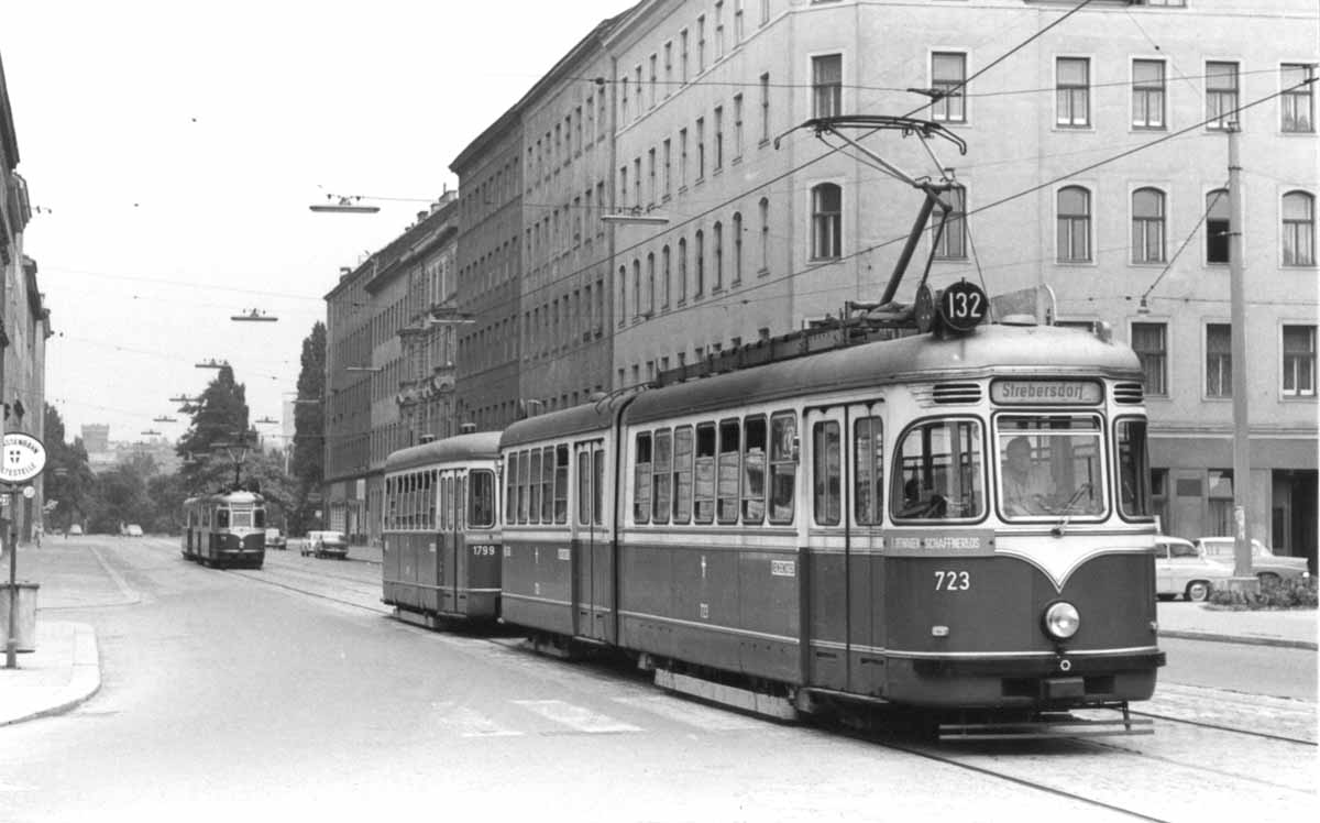 723+1799 als Linie 132 auf dem Gaußplatz gefolgt von einem Zug der Linie 331, bestehend ebenfalls aus den Typen F+l3. Foto: Carl Holzinger, 17. 7. 1971