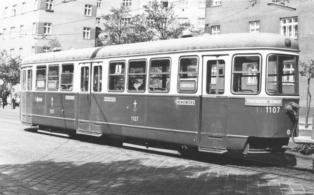 Der 1107 im Oktober 1973 als Linie A auf dem Elderschplatz im schaffnerlosen Betrieb. Lackierung des Wagens mit nur einer Zierleiste. Das Fehlen der Innentafeln in den Türen deutet bereits auf die beginnende Aufgabe des Fließverkehrs hin; vermutlich hat der Wagen auch bereits einen Türtaster bei der Tür 3 innen.