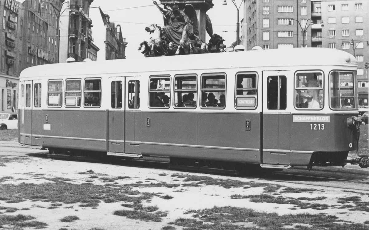 Das Aussehen nach Aufgabe des Fließverkehrs und mit Türtastern bei allen Türen innen und außen dokumentiert der im Februar 1974 auf der Linie BK eibngesetzte 1213. Auch die abnehmbaren Tafeln "Schaffnerloser Beiwagen" sind durch "Schaffnerlos"-Aufkleber ersetzt worden.