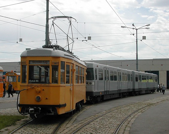 BH Nr. 6371 (intern BH2) + U-Bahn Doppeltriebwagen in der Hauptwerkstätte Simmering am 19.06.2004