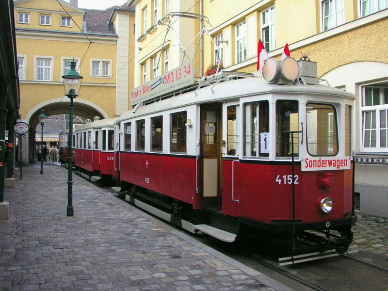Inhalt: Nostalgiezug aus Triebwagen Nr. 4152 Type M1 und zwei Beiwagen Type m2 oder m3 in der Haltestelle Grinzing. Quelle: Wikimedia Commons, wo auch die ursprüngliche Bildbeschreibung und die Versionsgeschichte nachzulesen sind. Autor: Martin Ortner, Wien, dort hochgeladen von Herbert Ortner. Datum: 30. Juni 2005